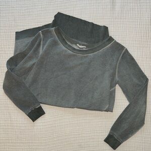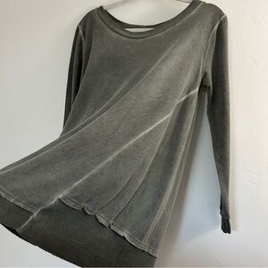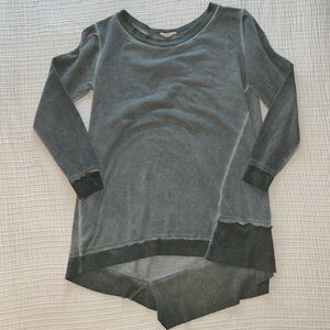 Olive green distressed wash long sleeve tunic. Natural dye look. Purchased from local boutique and size is not listed on tag - fits size SMALL best (Note: oversized fit around torso but arms are fitted. Could fit a petite Medium. Mid thigh length (I'm 5'-4" and this is where it hits me). Worn only twice and in near perfect condition! No signs of wear or imperfections.