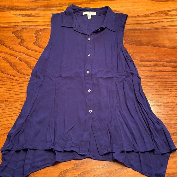 Cute! Asymmetrical navy button down tank. Cute under a blazer or cardigan. Only worn a few times, has been in storage. Iron and ready to go!