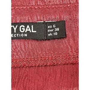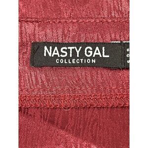 The product is a stylish asymmetrical burgundy satin skirt in size 6, reflecting a Y2K dark romantic goth aesthetic from the 90s. Made by the brand Nasty Gal, this short maxi skirt is designed for women who want to make a statement with their fashion choices. The unique asymmetrical feature adds an extra touch of interest to the already eye-catching color and theme of the skirt, making it a standout piece in any wardrobe.