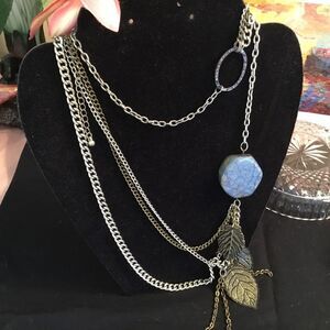 This beautiful asymmetrical necklace has silvertone and bronze chains, a grey stone and bronze leaves with tassels. It measures 30” on the inside of the three chains’ length or 38” on the outside link. It features a 3” extender as well. $8 each or bundle 3 of same price for $15 and save.