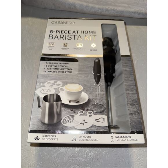The At Home Barista Kit by Casanero includes a frother, 12oz frothing pitcher, and stand, perfect for creating café-quality coffee drinks at home. Compatible with various branded coffee machines such as Braun, Baratza, and Nespresso, this kit is designed for use with a range of coffee makers, including espresso machines, coffee grinders, and French presses. The sleek black stainless steel pitcher and stencils make it easy to froth milk and create beautiful latte designs, while the battery-operated power source ensures convenient use. Ideal for coffee enthusiasts looking to elevate their home coffee experience.