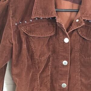 At Last & Company Girl's Lightweight Brown Corduroy Jacket Size Large. Blue embroidered x's above breast pockets. Long sleeves have slight bell shape at wrists. Silver colored metal buttons down front.
