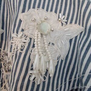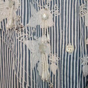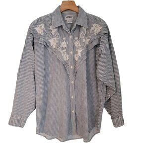 Vintage At Last Western Striped Blue Shirt Embroidery Pearl Button Up Cowgirl Sz M