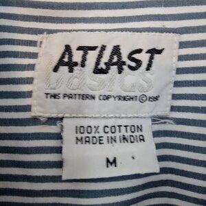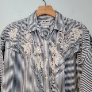 At Last Western Shirt Vintage Striped Blue Embroidery Pearl Button Cowgirl Med