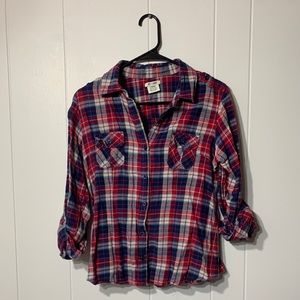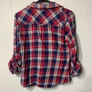 Right, white and blue soft flannel, great condition. Large size but fits and length more like a medium