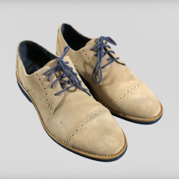 Men's suede dress shoes. Blue sole, laces to accent tan shoe.