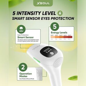 5 Power Levels & Ergonomic Design: The XSOUL IPL hair removal device for women/men offers 5 Power Levels - simply press the On/Off button to adjust to the Power Level that best suits your skin (start from Power Level 1 and work your way up as needed).