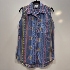 AtLast Basics Womens Blouse Sz M 1992 boue aztec Button Down sleevless 90’s.