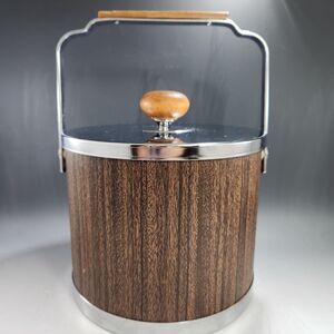 Perfect for entertaining & get togethers or a wonderful gift for the contemporary design lover. This is a vintage ice bucket by Atapco. This ice bucket is chrome and wood handle and knob with a faux wood body for easy cleaning. The interior is hard white plastic and is nice and clean. Includes a matching chrome set of tongs.