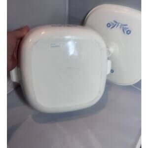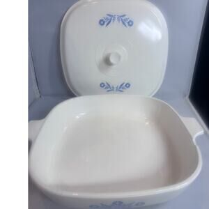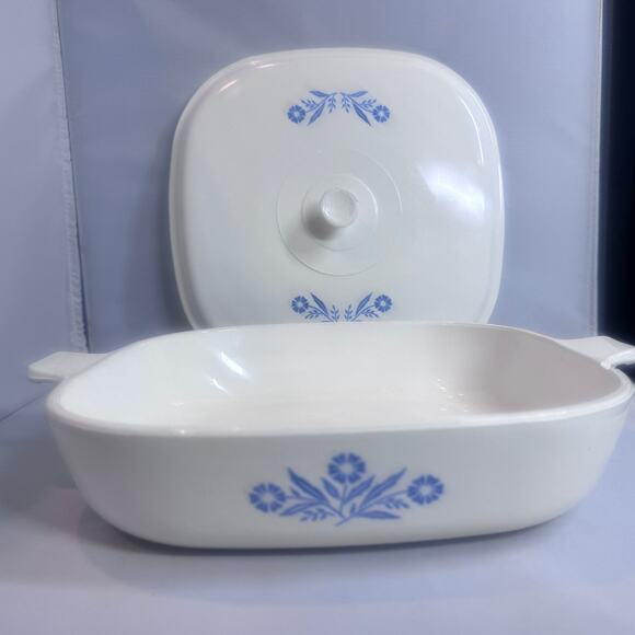 Vintage CorningWare casserole dish featuring the iconic "Blue Cornflower" pattern.