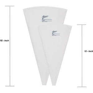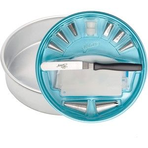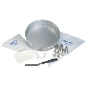The Ateco 335 is a comprehensive cake decorating set comprising 14 pieces, which includes a 9" x 2" professional cake pan, a 12" flex decorating bag, a 14" flex decorating bag, 6 decorating tubes, a standard coupler, 2 pastry