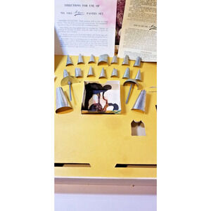 Ateco 1950/1960 Fancy Decorating Set is a nozzle set for cake and pastry decoration. There are some missing pieces. This set comes in a box with instructions included. It also comes with part of a cake decorating magazine. It is suitable for all occasions and was manufactured in the United States.