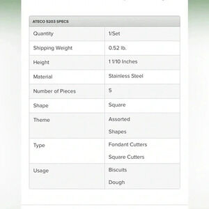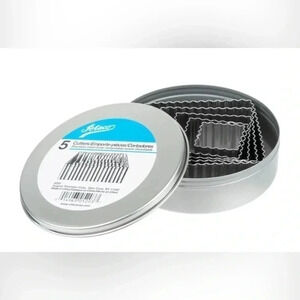 Great for biscuits, buns, cookies, and more, the Ateco 5203 5-piece stainless steel fluted square cutter set is perfect for your bakery, cafe, bistro, or restaurant. This graduated set of five cutters is made of durable stainless steel for repeated use, and comes in a variety of sizes to fit your needs. Great for cutting pastry dough or as a form for food, these cutters range from 1 1/5" to 3". Thanks to this set's fluted edges, it produces elegant, scalloped results on all foods. Furthermore, the cutters' top ledge is rounded enabling users to safely and comfortably use the cutters. This graduated set is nestable and fits inside the provided container, ensuring the set remains together while offering compact storage. Use them on their own or take advantage of the nesting design to create unique borders using two cutters. BRAND NEW!!!