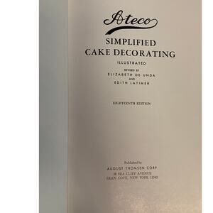 Simplified Cake Decorating by Ateco, Eighteenth Edition. Revised by Elizabeth De Unda and Edith Latimer, published by August Thomsen Corp., Glen Cove, New York. Illustrated throughout with step-by-step techniques and designs for decorators of all skill levels.
