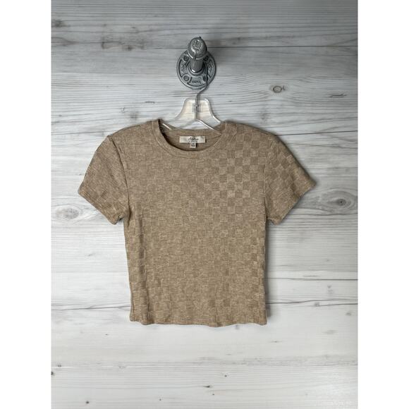 Atelier By Kirious Shirt Womens Small Beige Checkered Textured Knit Crop Top Tee