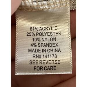 Materials: 61% acrylic, 25% polyester, 10% nylon, 4% spandex; RN 141178; made in China.