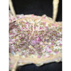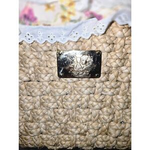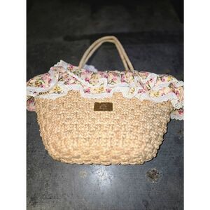 Beautiful woven straw satchel has floral and lace ruffled detailing with patching floral interior.2 interior pockets and 1 zippered pocket, bag is expandable with ribbon drawstring closure.