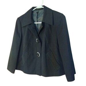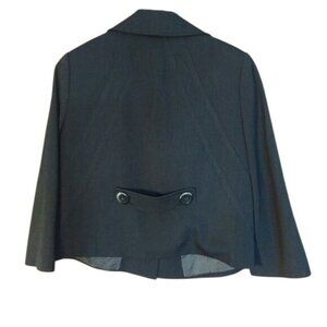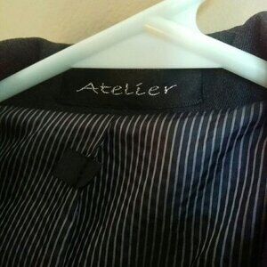 This adorable Atelier gray blazer jacket is in excellent condition! Size 2. Material is 63% polyester, 33% viscose, 4% spandex with 100% polyester lining. 3/4 sleeves. Three button closure, two front pockets. Very thin padding at the shoulders.