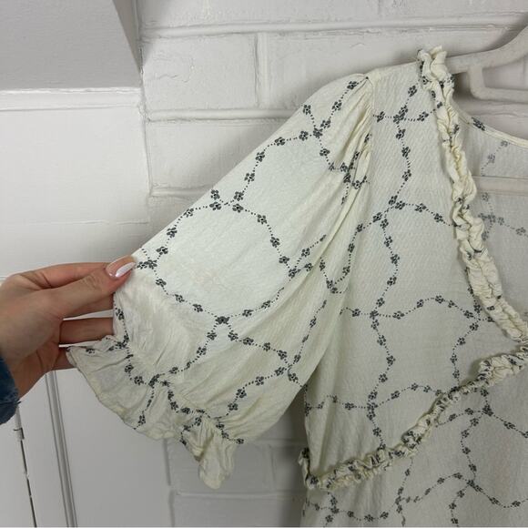 Good pre worn condition. Has a cream / light yellowish white color to it. Very spring and cottagecore like vibes. Peasant style blouse with floral pattern and ruffle detail. Slight puff sleeve. This is a Parisian French brand with European sizing 38. All sales final.