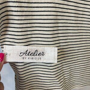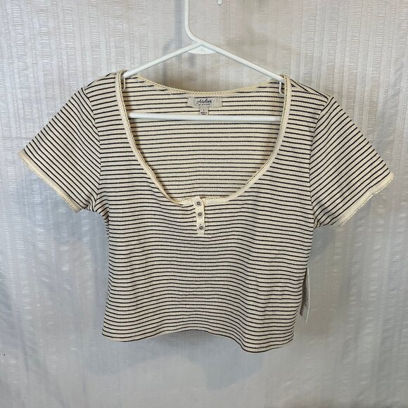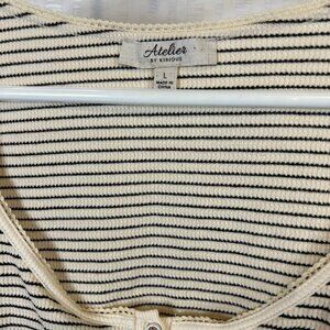 FEATURES/ACCENTS: Cream and black colored textured shirt. Lace detail around color and arm sleeves.
