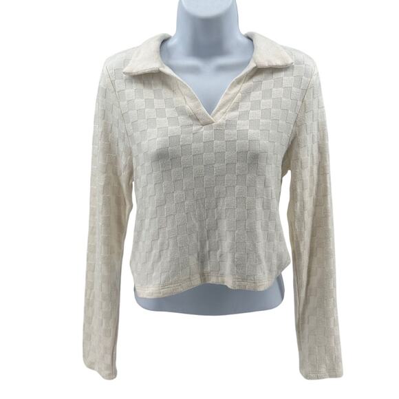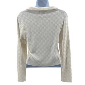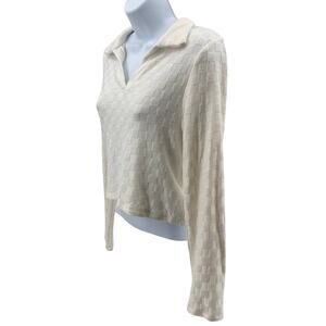 Atelier by Kirious Women’s Crop Sweater Size Medium – White Color, Pullover Style, V-Neckline, Collared, Long Sleeves, Soft Stretch Knit Fabric, Cropped Length, Lightweight and Fitted Silhouette, Minimalist and Modern Look, Perfect for Layering, Casual Street Style, or Elevated Everyday Outfits.