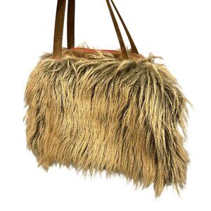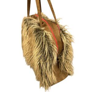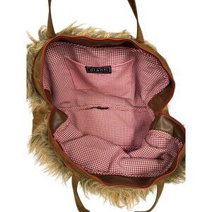 Atenti Brown Faux Fur Shag Weekender Overnight Travel Bag Red Trim Vintage
