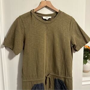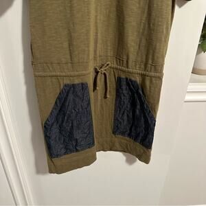 I adore this designer Athe by Vanessa Bruno green and blue mixed media cotton linen short sleeve pocket front mini tee shirt dress