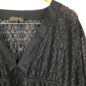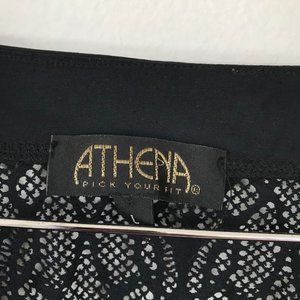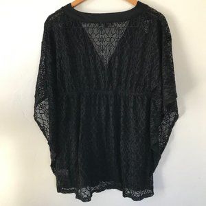Athena Deep V-Neck Swim Cover Up in Black, size Large. Good used condition, no visible flaws. V-neck, empire waist. All over lace with solid trim at neckline. Flutter sleeves. Elastic at empire waistline under bust for a comfortable fit. 92% Nylon, 8% Spandex. From a smoke-free home. Flat lay measurements: Shoulder to hem: 28.5". Armpit to armpit approx. 17".