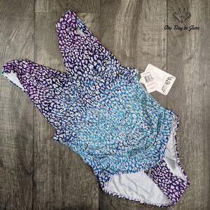 A most elegant surplice swimsuit in enchanting shades of blue and purple, designed to flatter the feminine form with graceful lines and superior craftsmanship. This Athena creation, fashioned from the finest polyester and spandex blend, promises both comfort and style for afternoons spent by the seaside or at one's private pool.