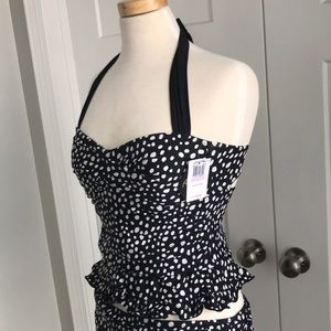 Darling polka dot swim suit. Ruched on sides, halter tie, skirted bottom with ruffles on the bottom, top has ruffles as well. Detail ruching at neckline. Let me know if more pictures are needed!