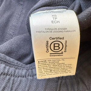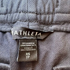A navy blue Atheta jogger for women in size XS. Made of blended fabric, it features a drawstring closure, elastic waist, and pockets. The jogger has a tapered leg style with elastic at the ankles. Designed for activewear, it is breathable, moisture-wicking, and offers stretch for comfort. Perfect for activities like walking, school, or driving.