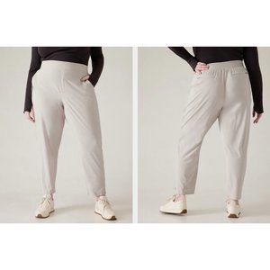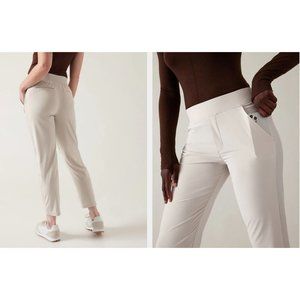 Athleta Abalone Grey Brooklyn Ankle Pant in Women's Size 4 is perfect for athleisure. This wrinkle-resistant, breathable pant features 2 zippered back pockets, 2 side hand pockets, and an elastic waist. The solid Abalone Grey pattern is sporty and chic.