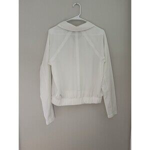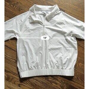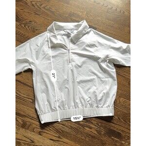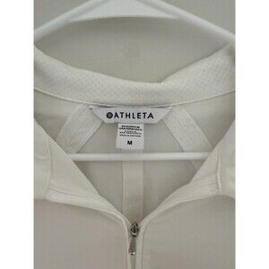 The Athleta 1/4 Zip Pullover Windbreaker Jacket is a stylish and functional outerwear option for women in size Medium. Made from a lightweight polyester blend, this sporty jacket features a sleeveless design with a pullover closure for easy wear. Perfect for travel or casual occasions, the white color and solid pattern make it versatile for various outfits. With features like stretch, quick dry capabilities, and being machine washable, this jacket is practical for outdoor activities in the summer, fall, or spring seasons.