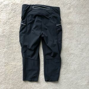 Solid black cropped Athleta yoga pants. They are in good condition. There is slight pilling on the butt (shown in pictures)