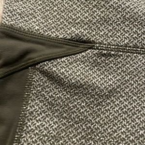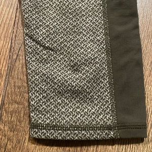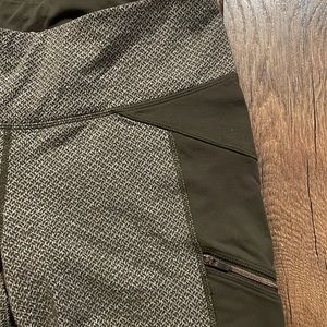 GUC herringbone leggings. Olive green panels, zip pockets, and small hidden pocket in waistband. No flaws, but definitely show wash wear (small pilling). Thicker, not thin like yoga leggings.