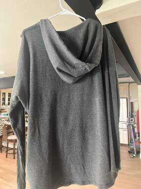 Athleta Purana Wrap Sweatshirt Hoodie in dark charcoal gray, Women's Size Large. This cozy wrap features a unique draped crossover front and an attached hood, perfect for layering after a workout or for casual everyday wear.