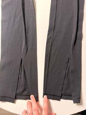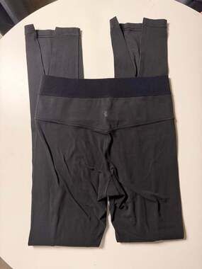 Athleta Aura Split Pant in black, Women's Size S. High-waisted yoga leggings featuring a comfortable wide waistband with ribbed side panels and stylish split hems at the ankles. Soft, moisture-wicking fabric designed for yoga, Pilates, or everyday athleisure wear. Excellent pre-owned condition with no visible stains or holes. Perfect for a versatile workout-to-street look.