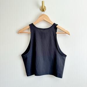 Details: Athleta Crew Neck Pullover Activewear Cropped Tank Top - Size: M- Color: Black- Material: 83% Polyester, 17% Spandex- Features: Crew neck, pullover, lightweight, machine wash, cropped, sleeveless, logo, comfort, breathable, casual, activewear. Medium-High Impact Wicking
