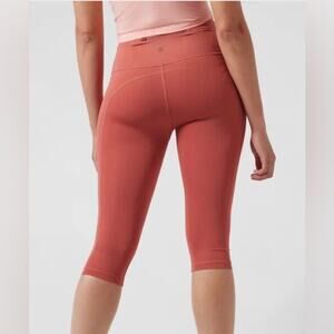 This is a great pair of cropped leggings from activewear brand Athleta. Color is muted red. Back zip pocket.