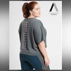 Athleta x Allyson Felix Olive “Break Records/Break Barriers” Graphic Tee. Size Large. Excellent Pre-Owned Condition. Short sleeve tee with metallic graphic lettering on the back. Slightly cropped. Easy fit. Ships from a smoke and pet free home.