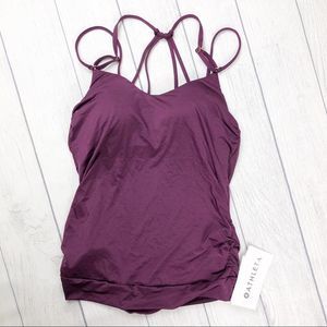 Brand new with tags. Athleta Amethyst Aqualuxe Tankini. Strappy detail on back. Ruched sides. Gold hardware. Built in cups. Adjustable straps. Size XS.