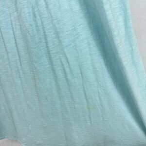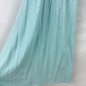 Athleta light weight aqua blue strappy halter dress with built in bra. Size XS and is on the small side. Not made for busty gals. Dress is 60% cotton, 40% modal; the bra is 57% cotton, 38% polyester, and 5% spandex. There are some yellowish stains on the lower skirt part of the dress.