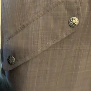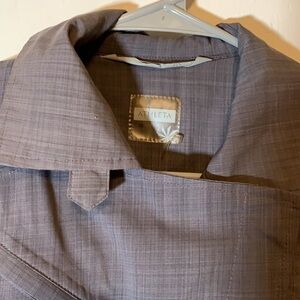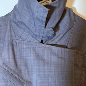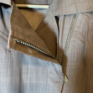 Very nice brown lightweight jacket, asymmetrical zipper, two pockets at hip with snaps, one small zippered pocket at chest, cocoon collar closed with magnetic tan, open collar (if preferred), parachute like material with mesh lining, two cute accent buttons at armpit, nylon elastic cuffs, very nice condition, no visible flaws
