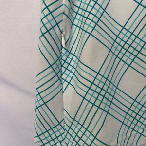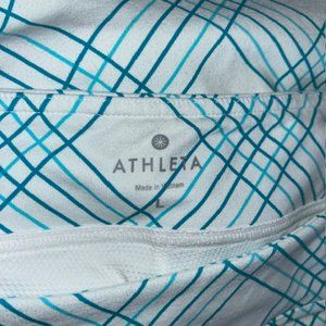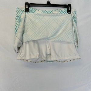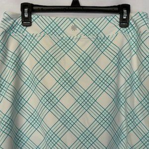 Like New ATHLETA Athletic Skort - White with Aqua Blue-Green plaid stipes. Size: Large. Wear as a casual skort or for athletic wear. This stretch, breathable material makes this skort comfortable to wear. Semi-fitted - as it flows out at the hem. There is a single zipper pocket. In great condition. No damages, rips or tears.
