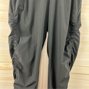 Jogger has loose fit and tapered bottom with elasticized rouching