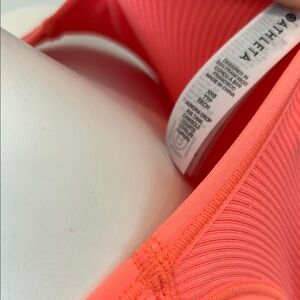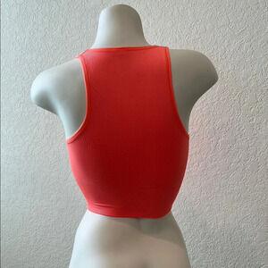 Experience comfort and style with this coral ribbed cropped tank top from Athleta, featuring a seamless design and wide shoulder straps. Its compression fit ensures support for low to medium impact activities, making it ideal for both workouts and casual wear.