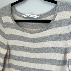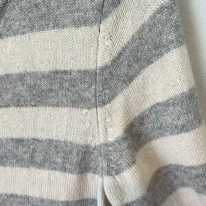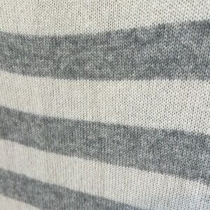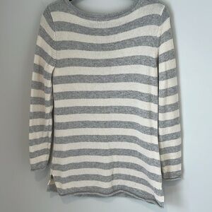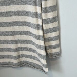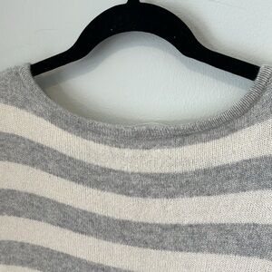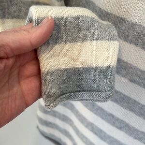 This is a beautiful cashmere sweater with ivory and gray stripes throughout. It has a roll hem on the bottom and sleeves, and a wide crewneck. It's true to size and in great condition. It is tunic length and has a small split seam on the sides. Women's large. Has a good amount of stretch. Retails $198, sold out online.