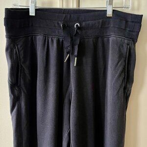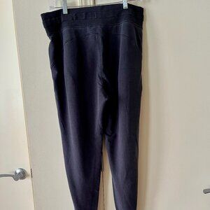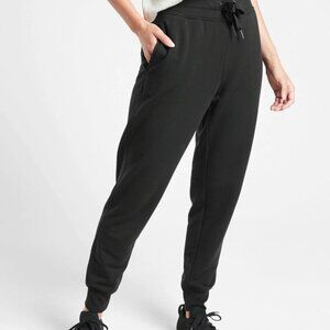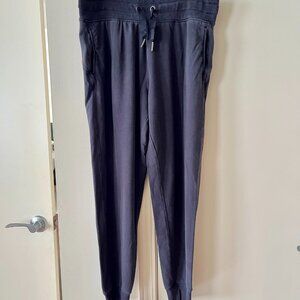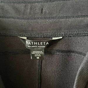 Athleta joggers women medium black balance pants tapered leg elastic waist drawstring pockets casual comfy lounge travel soft stretch activewear gently worn discoloration excellent used condition