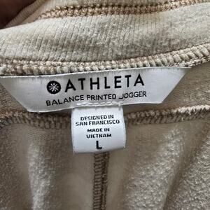 Athleta Balance tan camo jogger sweatpants size large. Tapered legs, soft material, drawstring waist, pockets.