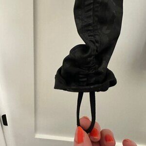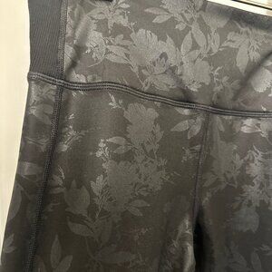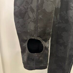 These leggings from Athleta feature a black on black printed floral pattern which has a slight bit of shimmer. The waist band is wide and the back waist has a rib knit fabric. There are holes for your feet at the bottom so you can wear them like a stirrup. However they are long enough and the leg can be ruched by pulling the ribbon, so you can also wear them without your foot in the stirrup. These are sleek and stunning on!